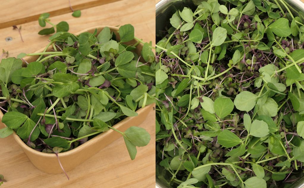 sunflower shoots (nutty crunch), pea tendrils (sweet), broccoli (mild), radish (peppery heat), red/green cabbage (colour & crisp), plus occasional mustard, kale, or coriander for complexity.